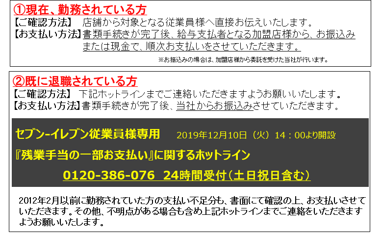 ご自身が該当されるかどうかにつきましては、下記をご確認いただくことともに、「セブン‐イレブン従業員様専用『残業手当の一部お支払い』に関するホットライン」を開設しておりますのでお問い合わせいただきますようお願い申し上げます。
